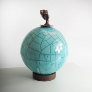 Sculpture céramique réalisée selon la technique japonaise du « raku». La tête est en bronze, coulé par l'artisan. Chaque pièce est unique.
